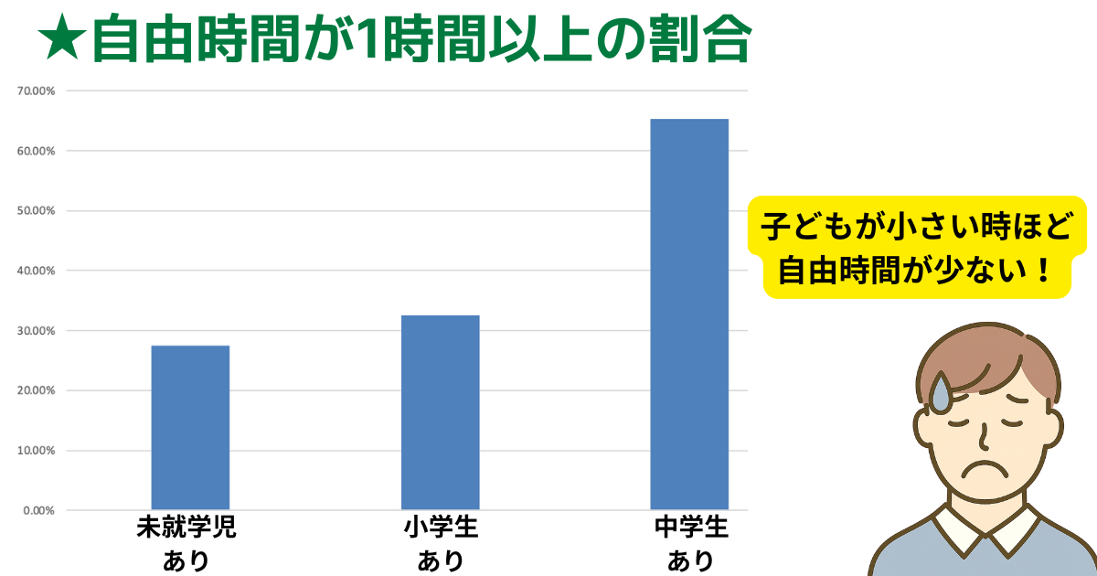 子どもの年齢が上がるほど「1時間以上の自由時間」割合が増加(未就学児<小学生<中学生)